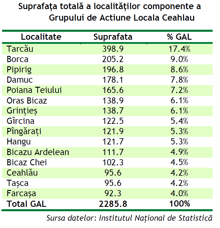 Suprafața totală a Grupului de Acțiune Locală Ceahlău este de 2285.8 km², ceea ce reprezintă 38.8% din județul Neamț. Comuna Tarcău este localitatea cu cea mai mare suprafață totală (398.9 km² – 17.4% din suprafața GAL Ceahlău), la polul opus fiind situată comuna Farcașa ce reprezintă doar 4.0% din total Microregiunii Ceahlău. Teritoriul Grupului de Acțiune Locală Ceahlău este alcătuit în cea mai mare parte din formațiuni muntoase. Zona joasă este limitată de luncile și terasele apelor curgătoare, aspect favorabil instalării așezărilor omenești și terenurilor arabile.