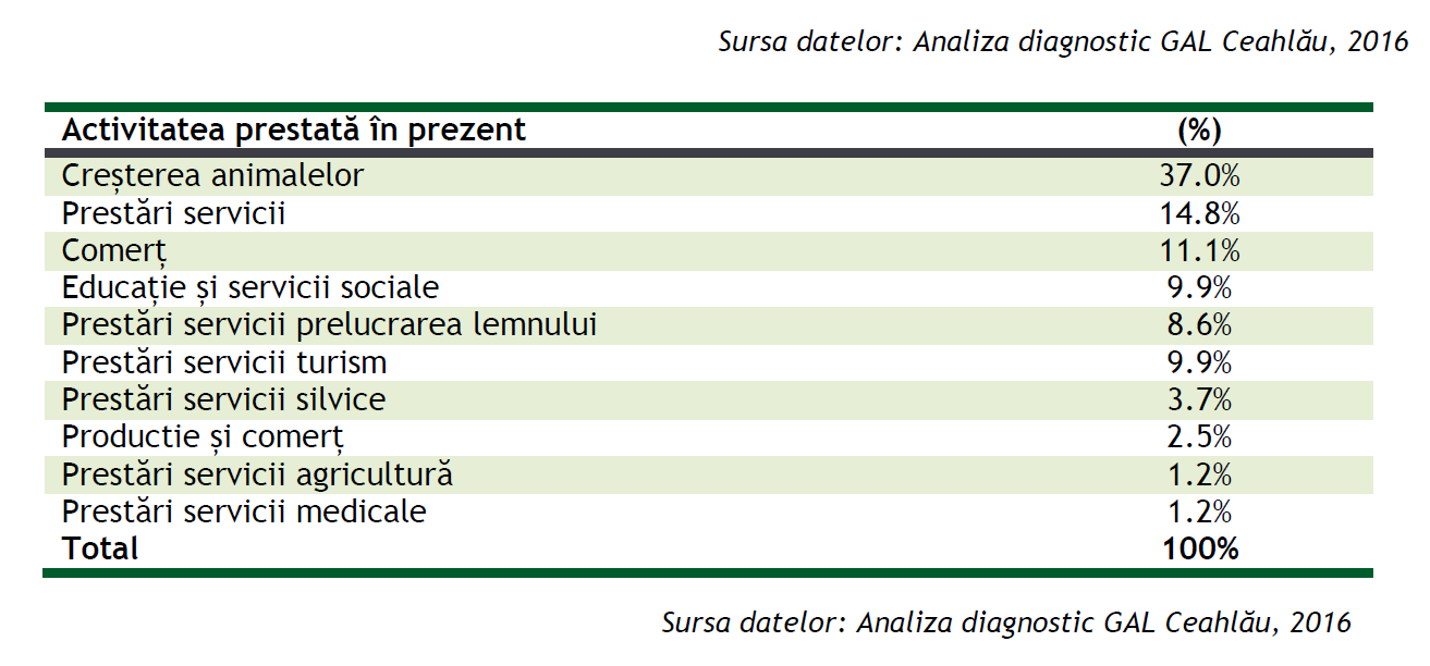 Ocupațiile de bază ale populației din teritoriul GAL Ceahlău sunt creșterea animalelor(37%), prestări servicii(14,8%) și comerț(11,1%), urmate de alte îndeletniciri specifice zonei montane, cum ar fi prelucrarea lemnului și turismului, date reieșite din Analiza Diagnostic a Teritoriului de la nivelul anului 2016. Astfel, teritoriul inclus în GAL Ceahlău este omogen din punct de vedere economic, desfășoară aceleași activități și întămpină aceleași dificultăți, ce se doresc a fi remediate prin măsurile specifice și adaptate nevoilor populației din areal.